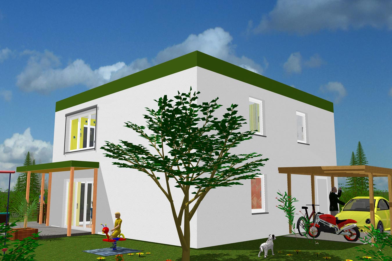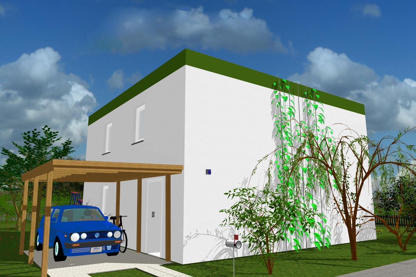 Dieses Passivhaus hebt sich von der Masse ab. Zu den vielen praktischen Details zählen das Carport, das den Eingang überdacht und der optionale Laubengang. Er verleiht besonderes Flair und dient zugleich dem sommerlichen Wärmeschutz. Das begrünbare Flachdach auf einer massiven Betondecke kann besonders gut mit Solartechnik und Photovoltaik ausgerüstet werden.